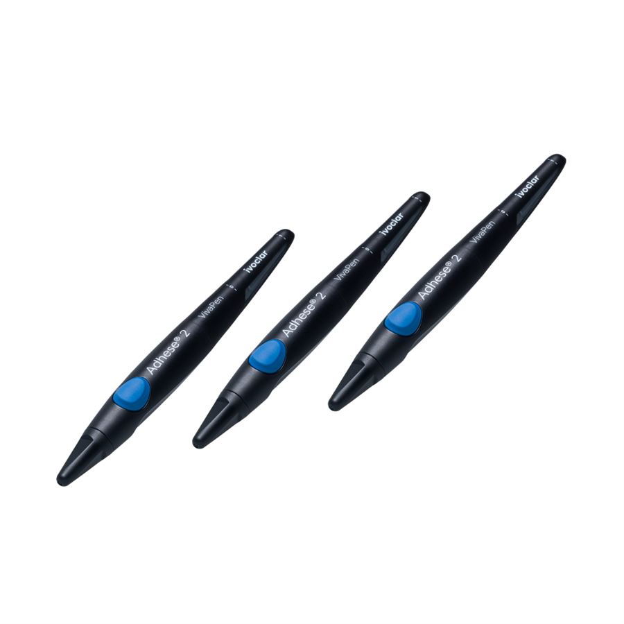 Adhese 2 LC VivaPen kit obsahuje: 2 ml adheziva v dávkovači VivaPen a 4x 25 ks černých kanyl pro tuhnutí světlem.