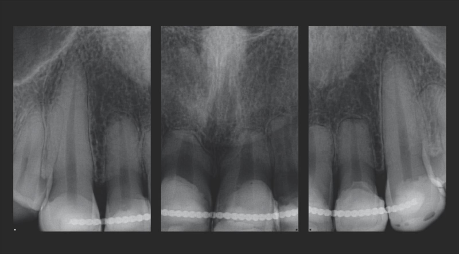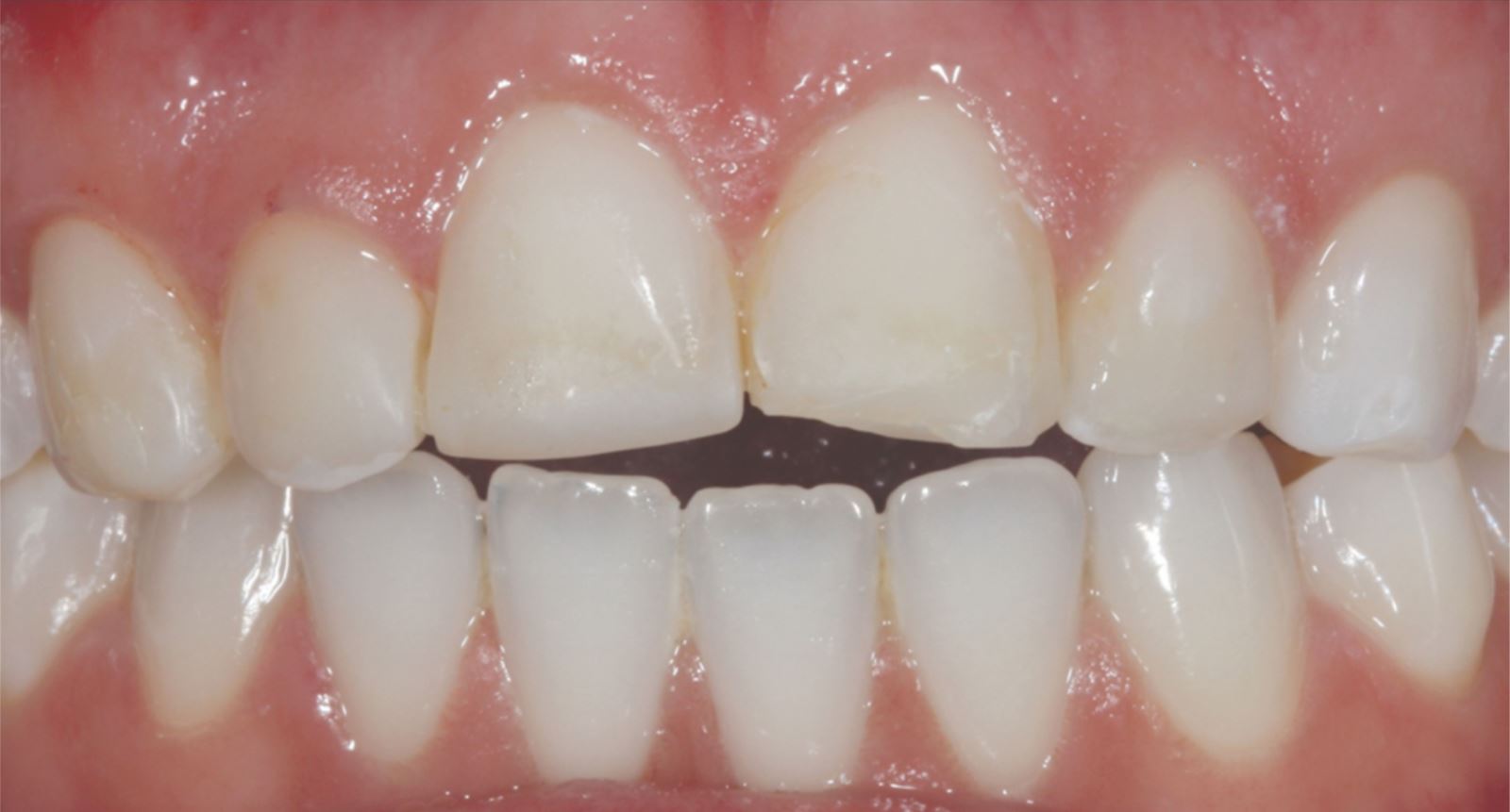 Pacientka ve 20 letech s anamnézou traumatu horních frontálních zubů. Přestože trauma proběhlo, zuby zůstaly stabilní, takže implantáty nebyly nutné.