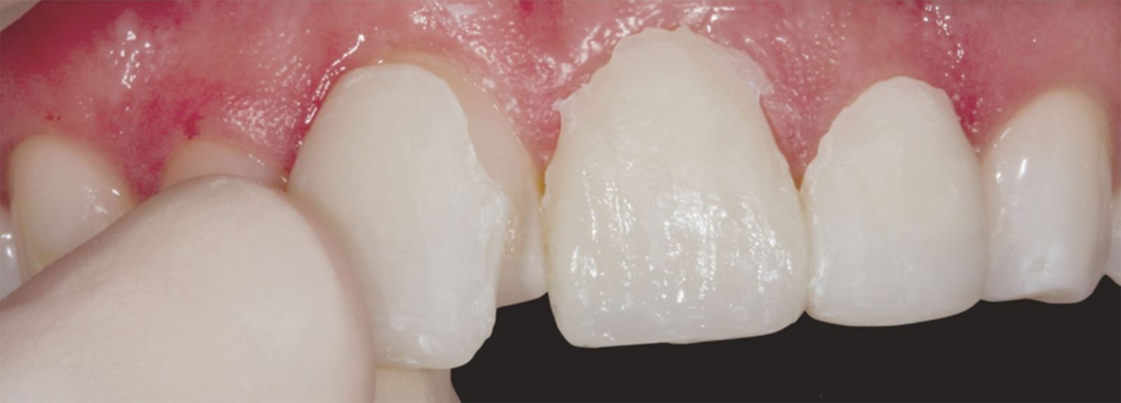 Kompozit Transcend v odstínu B1D byl aplikován od dvou třetin výšky korunky od incisální hrany směrem k cervikální oblasti, kde se postupně ztenčoval. Odstín Universal Body (UB) byl nanesen v cervikálním třetině, závěrečné vrstvy tvořil Enamel White (EW) a malé množství UB v marginální oblasti pro přirozené splynutí.