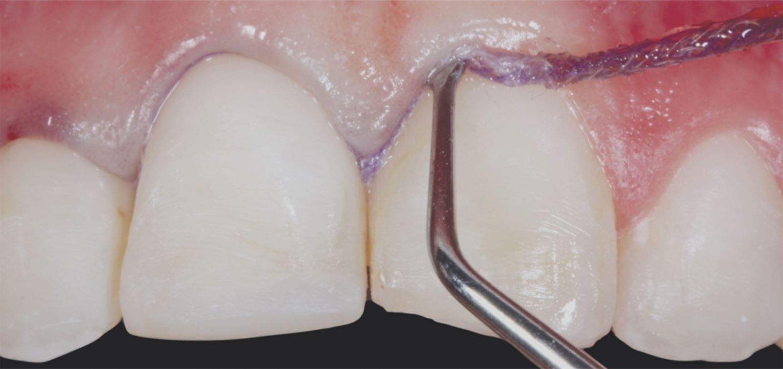 Do gingiválního sulku byla vložena pletená retrakční vlákna Ultrapak™ velikosti #0 k přípravě pro leptání.