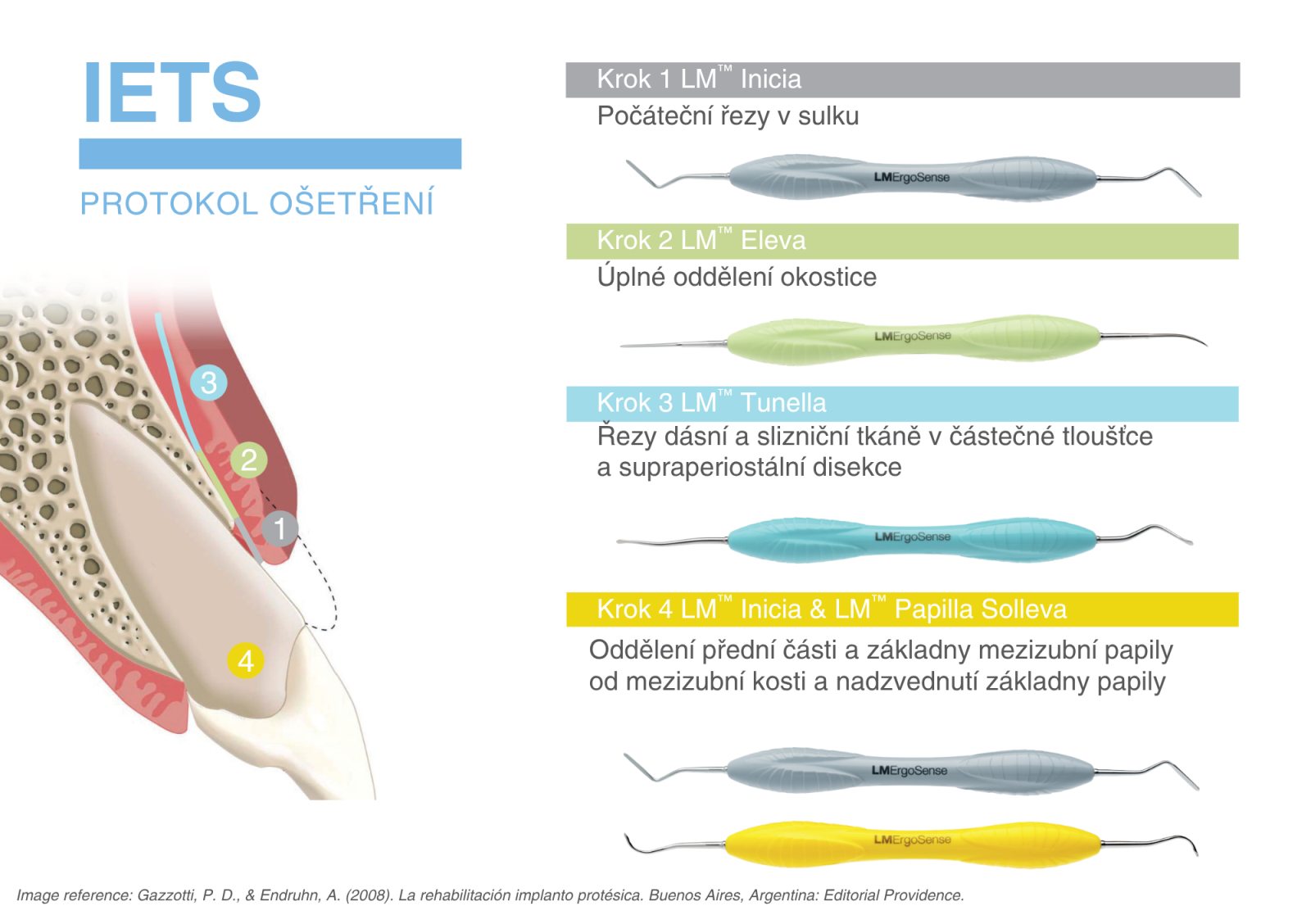 Velkou předností řady LM Periodontal Surgery je i to, že jednotlivé nástroje na sebe funkčně navazují. Brožura popisuje tzv. IETS protokol pro minimálně invazivní léčbu gingiválních recesů. Ten ukazuje, jak lze instrumentárium využít v logické posloupnosti jednotlivých chirurgických kroků.