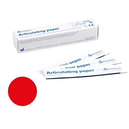 Oboustranný artikulační papír síly 40 µm se používá k úpravě okluzálních ploch v ordinacích i laboratořích.