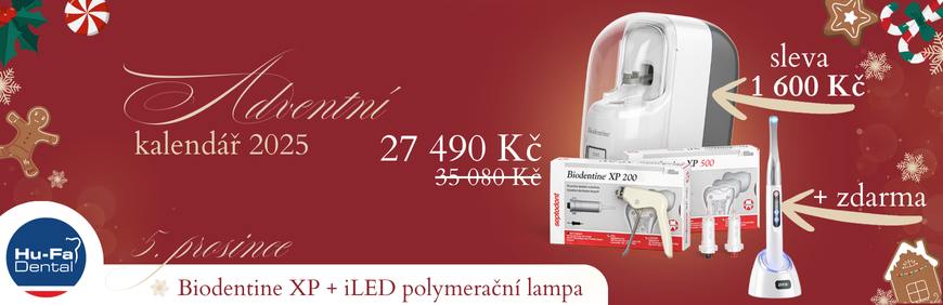 Pouze dnes můžete objednat Biodentine XP starter pack se slevou a získat zdarma LED polymerační lampu iLED zcela zdrama. Do košíku vložte Biodentine XP starter pack a do pole poznámka v nákupním košíku nezapomeňte uvést kód ADVENT25. Cena zboží Vám bude upravena ručně. Dovolujeme si Vás upozornit, že pro velký zájem bude objednané zboží dodáno až v druhé polovině ledna 2026. Děkujeme za Vaši trpělivost.