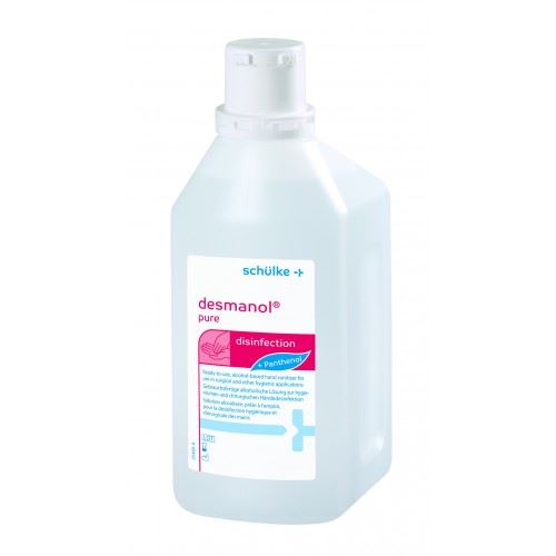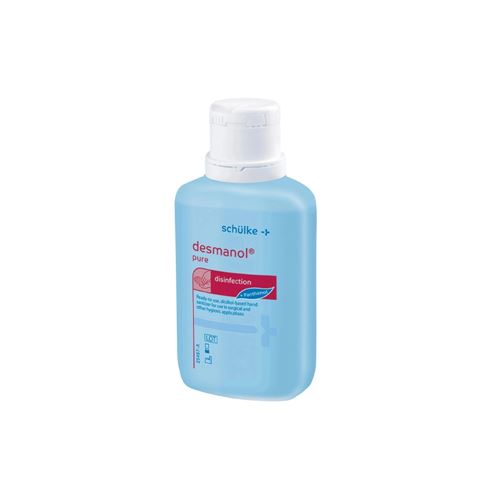 Desmanol Pure čirý roztok - Okamžitě použitelný vtíratelný přípravek na bázi isopropanolu, bez barviv a parfémů, určený na dezinfekci rukou, obsahující složky pro péči o pleť.