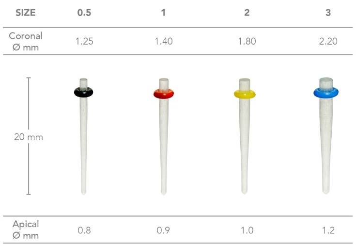 D.T. Light-Post je dostupný ve 4 barevně rozlišených velikostech, doplněných o odpovídající vrtáčky. Barevné značení na čepu i vrtáčku usnadňuje orientaci při práci a výběr správné velikosti v různých klinických situacích. Čepy i vrtáčky jsou baleny hygienicky v blistrech.