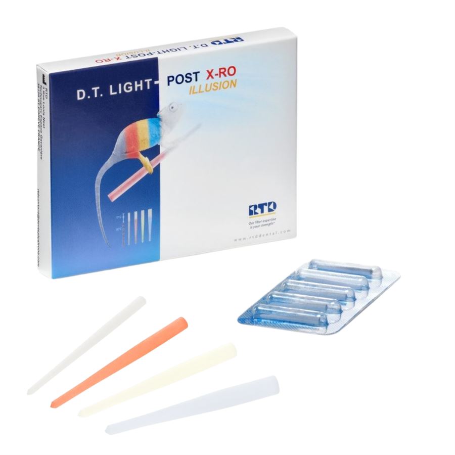 D.T. Light-Post Illusion X-RO je vylepšený skelný kořenový čep určený pro rekonstrukci endodonticky ošetřených zubů. Využívá patentovaná vlákna X-RO, která zajišťují mimořádně vysokou pevnost v ohybu, a současně nabízí vysokou rentgenkontrastnost i velmi dobrou světelnou transmisi. Díky osvědčenému dvojitě kónickému tvaru se čep dobře přizpůsobuje preparovanému kořenovému kanálku a umožňuje šetrnější preparaci se zachováním maximálního množství dentinu.