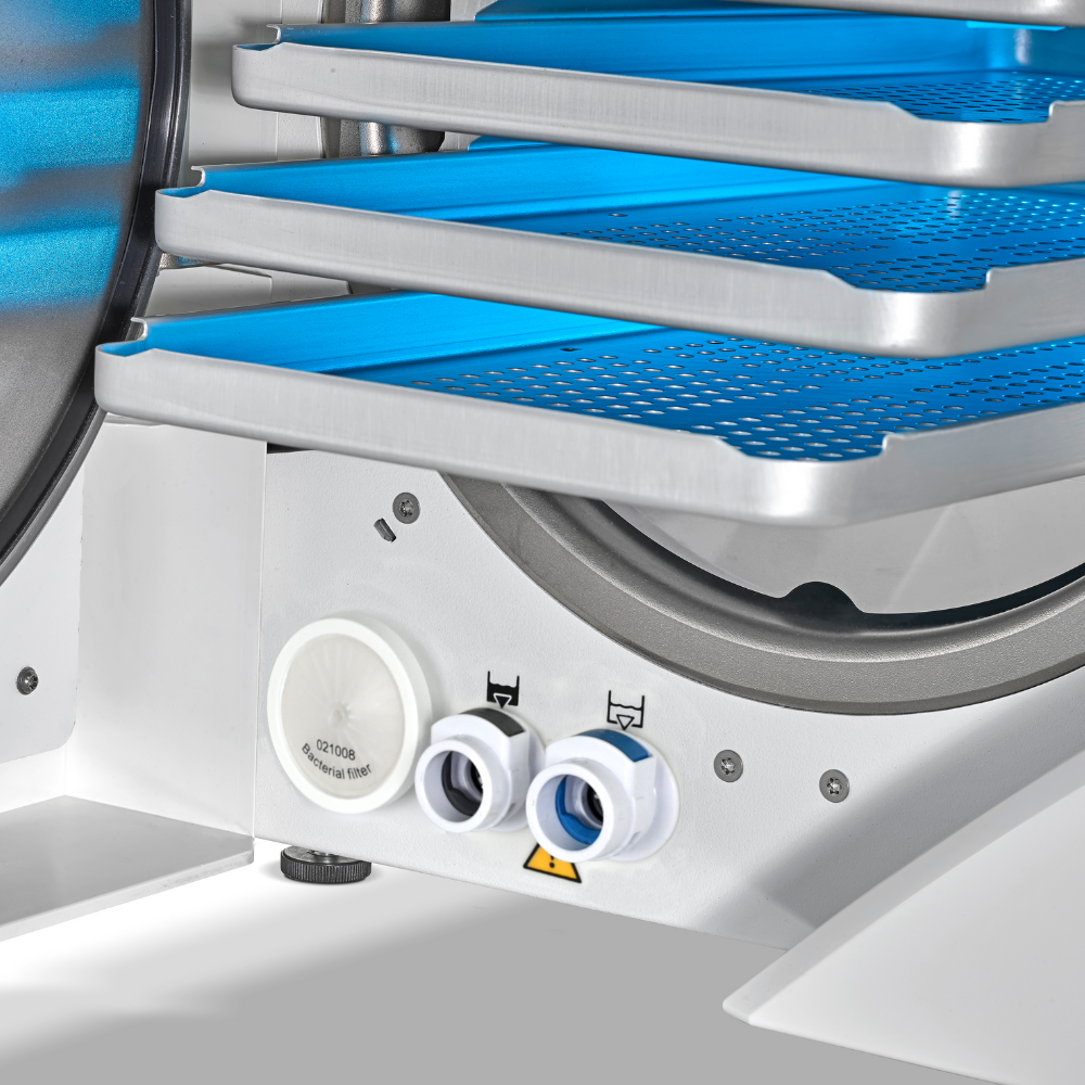 Výkonný a spolehlivý autokláv třídy B s nerezovou komorou o kapacitě 24 l (5 táců, náplň až 7 kg materiálu). Intuitivní obsluha a ovládání pomocí dotykového displeje usnadňuje práci. Rychlé vytváření páry a zlepšený proces sušení poskytuje nejlepší výkon a nejrychlejší pracovní cykly ve své kategorii. Záznam dat na USB nebo vestavěnou tiskárnou.