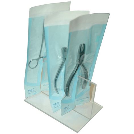 • Obdélníkový stojánek pro uspořádání zabalených ortodontických kleští a nůžek po sterilizaci.