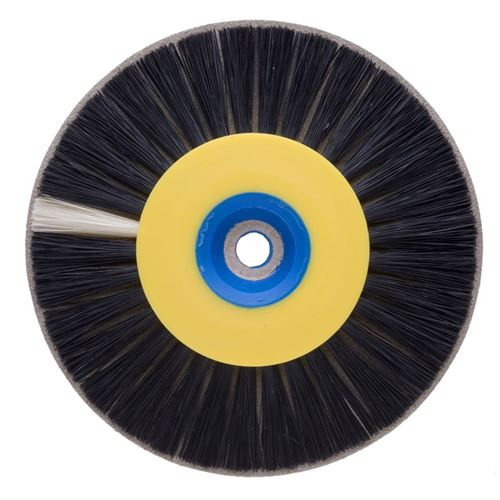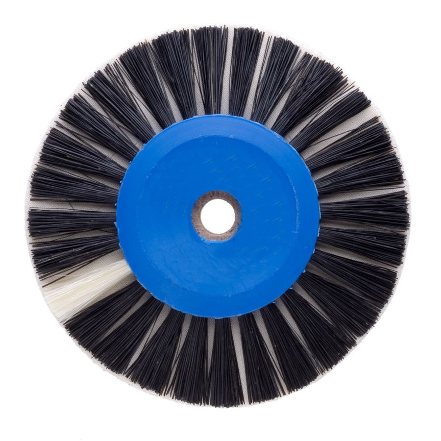 Soustružící kartáč s mušelínem mezi černými štětinami. Výborný jako předleštění akrylových protéz.