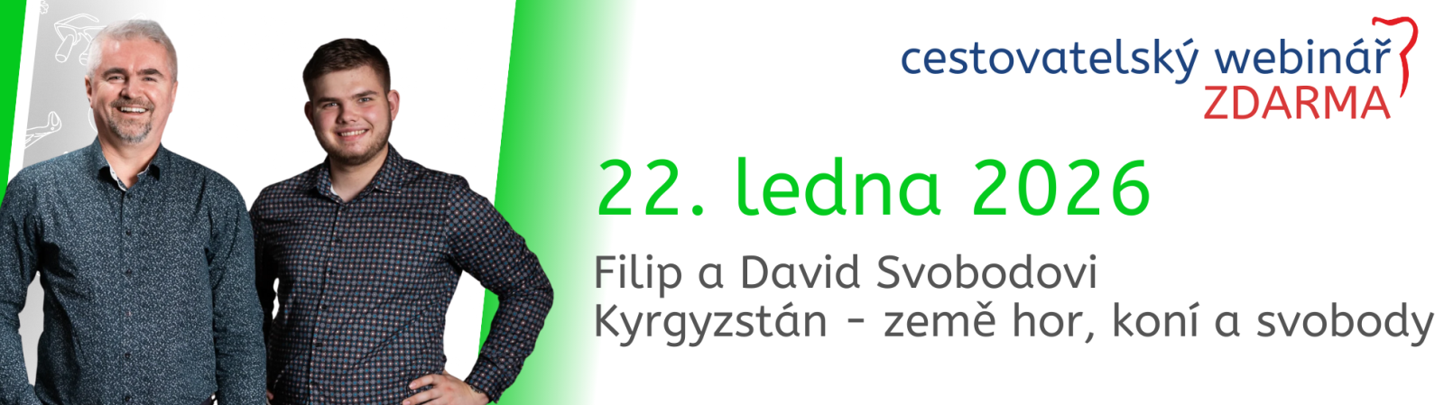 Zveme vás na nezapomenutelný webinář plný úžasných fotek, poutavých příběhů a neopakovatelných zážitků z putování po Kyrgyzstánu a Kazachstánu, který cestou i necestou, legendárním vozem UAZ Buchanka projeli otec a syn Filip a David Svobodovi.