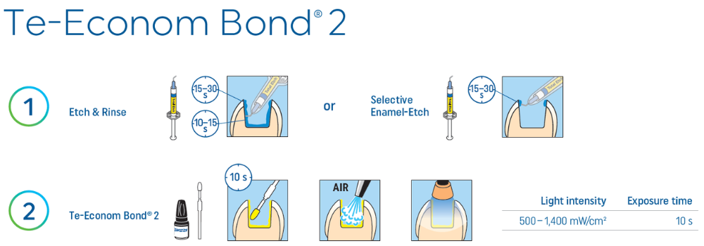 Te-Econom Bond® 2 je jednosložkové světlem tuhnoucí adhezivum určené pro použití s total-etch technikou. Spolehlivě se váže na sklovinu i dentin a nabízí jednoduchou aplikaci s vysokou mírou bezpečnosti.