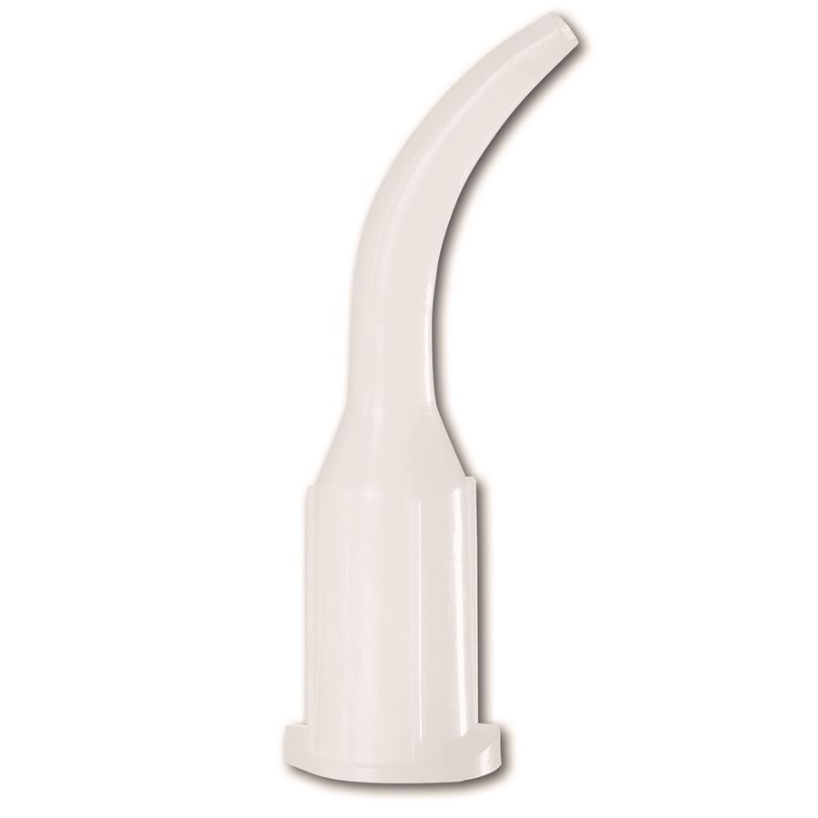 Bílé, zahnuté aplikační kanyly s velkým průměrem (O 2,0 mm) k nanášení vysoce viskózních materiálů. Použití s: Consepsis Scrub, Opalustre, OraSeal těsnění a tmel, UltraTemp